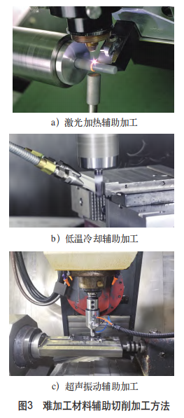 低溫冷卻輔(fǔ)助加工[10](見圖3b)則是使用液氮、高壓二氧化碳氣體等冷卻介質(zhì)噴塗到切削部位,對切(qiē)削加工過程進行冷卻,避免因為材料導熱(rè)性能差引起的局部切(qiē)削溫度過高問題,還使得工(gōng)件局部冷脆,增(zēng)強斷屑效果(guǒ)。英國的Nuclear AMRC公司成功使用高壓二氧化碳氣體對鈦合金的加工過程進行冷卻,與幹切削狀(zhuàng)態對比分析表明,低溫冷卻輔助加工不(bú)僅能夠降低切削力,提高切削加工表(biǎo)麵的質量,還能有效減小刀具磨損,增長(zhǎng)刀具的使用壽(shòu)命。此外,超聲振動輔助加工[11,12](見圖3c)也是難加工材料高效切削加工(gōng)的有效方法。通過在刀具上施加(jiā)高頻、微小(xiǎo)幅度的振動,實現加工過程中(zhōng)刀(dāo)具(jù)與工件之間發生間斷性分離,改變了材料去除機理,增強(qiáng)了動(dòng)態切削的穩定性,有效避免刀具(jù)與已加(jiā)工表麵間的摩擦,降(jiàng)低(dī)切削溫度和切削力,降低表麵粗糙度值,減(jiǎn)小刀具磨損,其優良的工藝效果已經得到廣泛的關注。