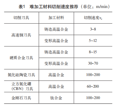 切削參數同(tóng)樣是影(yǐng)響(xiǎng)加工效(xiào)果的重要因素,對應材料使用合適的(de)切削參數加工能(néng)夠有效(xiào)提高加工質量(liàng)與效率。以切削速(sù)度參數為例,切削速度低容易在(zài)材料表麵形成(chéng)積屑瘤區,降低表麵加工精度(dù);切削速度高容易發(fā)生熱量積聚,引起工(gōng)件和刀(dāo)具的燒傷。對(duì)此,哈爾濱理工大學翟元盛教授團隊分(fèn)析常用難加工材料的機械物理性質,通過正交加工試驗總結出難加(jiā)工材料切削(xuē)速度推薦表[14](見表1),使(shǐ)用表中推(tuī)薦的刀具和切削速度進(jìn)行(háng)加工能夠有效減小加工缺陷(xiàn)與刀具磨損,提高加工質量。