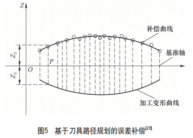 基於上述(shù)的預測模型(xíng)或(huò)在機測量技術,人們能(néng)夠對加工參(cān)數進行優化甚至是(shì)實時調控。主流的方向(xiàng)是通過刀具路徑的重新(xīn)規(guī)劃(huá)來對(duì)變形和振動造成的誤差進行補償。這一方向常用的方法是(shì)“鏡(jìng)像補償法”[20](見圖5),該方法通過(guò)對名(míng)義刀具軌跡進(jìn)行修正(zhèng),補(bǔ)償單次切削的變形量(liàng)。但是(shì)單次補償(cháng)會產生(shēng)新的(de)加工變形(xíng),因此需要通過多次補償在切削力和加工變形之間建立迭代關係,逐次(cì)修正變形量。除了基(jī)於刀具路徑規劃進行(háng)主(zhǔ)動誤(wù)差(chà)補償的方法之外,許多學(xué)者也在研究通過優化調控(kòng)切削參數、刀具參數等方(fāng)式來控製變形和振動。對於某型號航空發動(dòng)機葉片的切削加工,改變加(jiā)工參數進行多輪正交(jiāo)試驗,基於試驗數據分析各切削參數、刀具參數對葉(yè)片加工變形、振動(dòng)響應的(de)影響規(guī)律[21-23],建(jiàn)立經驗預測(cè)模型,從而優選加工參數(shù),有效減小