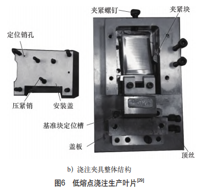 航空發動(dòng)機(jī)葉片傳統(tǒng)加工工藝中的工藝裝備是使(shǐ)用低熔點合金等相變材料進行填充輔助支撐,即對工件毛坯進行六點(diǎn)定位夾持後,將工件的定位基準通過低熔點合金澆注成為一(yī)個澆(jiāo)注塊,對工件進行輔助支撐(chēng),並且把複雜的點定位轉(zhuǎn)換成規則的麵定位,進而進行待加工部位的精密加(jiā)工(見圖6)。這種工藝方法存在明顯的缺陷:定位基準轉換導致定位精度(dù)下降;生(shēng)產準備複雜、低熔點合金的澆注和融化也帶(dài)來了工件表麵的(de)殘留和清理(lǐ)問題(tí),同時澆注和(hé)融化的工況也比較惡劣[30]。為了解決上述工藝缺陷,常用的方法是(shì)引(yǐn)入一(yī)種多點支(zhī)撐結構(gòu)與(yǔ)相變材料相結合(hé)[31],支撐(chēng)結構上端與工件接觸進行定位,下端浸入(rù)低熔點合金腔室中,基於低熔點合金的相變特性實現柔(róu)性輔助支撐。雖然引入支撐結構能夠避免低熔點合金接觸葉片產生的表麵缺陷,但是受到相(xiàng)變材(cái)料的性能限製,相變柔性工裝無法同(tóng)時滿足高剛度和高響應速度兩(liǎng)大需求(qiú),難以應用於高效率自動化(huà)生產當(dāng)中。