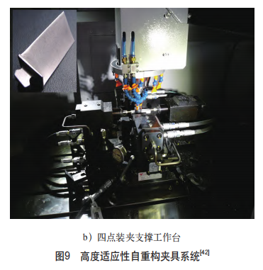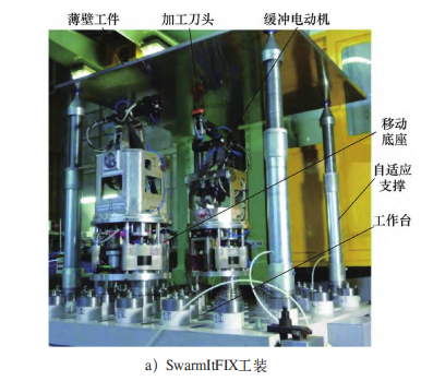 目前,國內外學者均在自重構群夾具方麵進行了一些研究與嚐試。國外方麵,歐盟項目SwarmItFIX開發了(le)一種新的高度適應性(xìng)自(zì)重構夾(jiá)具係統(tǒng)[41],該係(xì)統使用一組移動輔助支(zhī)撐在工作台上自由移動並實時重新定位,以更好地支撐加工零件。SwarmItFIX係統的原型已在該項目(mù)中實現(見圖9a),並在一家意大利(lì)飛機製造(zào)商的場地上進行了測試。國內則是有清華大學王輝團(tuán)隊製(zhì)作了一種可與機床協同控製的四(sì)點裝夾支撐工作台[42](見圖9b),可以在渦輪葉片榫根的精加工過程中對處於懸臂狀態的榫根進行支撐以及自動刀具避讓。在加(jiā)工過程中,四點輔助支撐與數控加工中心協同配合,根據刀具運動(dòng)位置重構四點接觸狀態,既避免(miǎn)了刀具與輔助支撐相互幹涉,又(yòu)保證了支撐效果。