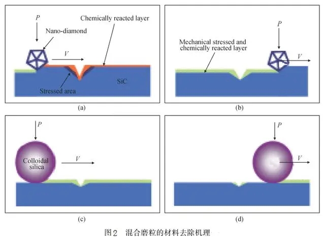 Park等將ZrO2磨粒(lì)與SiO2磨粒進行混(hún)合,Lee等將納米金(jīn)剛石磨粒與SiO2磨粒混合,可以提升SiO2磨粒的研拋效率。在混合磨(mó)粒中,隨著納米金剛石磨粒濃(nóng)度的增加,材料的研拋效率(lǜ)也同步增加;在研拋過程中,納(nà)米(mǐ)金剛石磨粒主導工件表麵材料(liào)的去除,SiO2磨粒則負責殘留機(jī)械加工痕跡的去除。