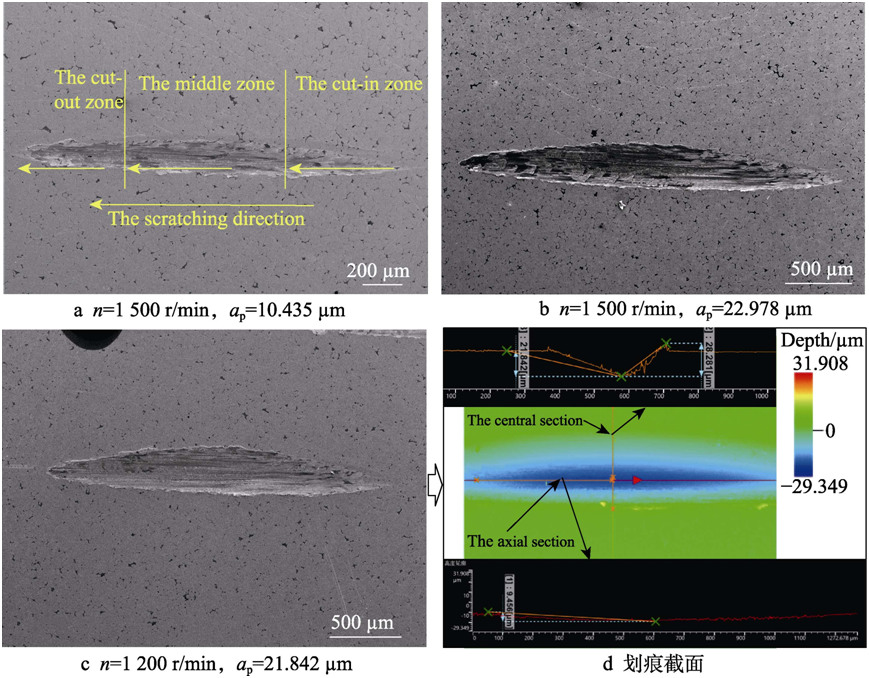 2)單磨粒刻劃鎢合金在不同刻劃階段的形貌有所(suǒ)不同。在切入端,材料依(yī)次(cì)發生了塑性變形,在劃痕兩側形成隆起、微裂紋,鎢相與黏(nián)結相的混雜交融,即將進入去除(chú)階(jiē)段;在劃(huá)痕中段,主要以材料去除為主,出(chū)現了材料的微(wēi)卷起和材料卷起現象,沿著刻劃方向(xiàng)卷起現象越嚴重(chóng),實驗現(xiàn)象與仿真現象吻合;相較於切入端,切出(chū)端材料的卷(juàn)起形貌發生惡化,實(shí)驗