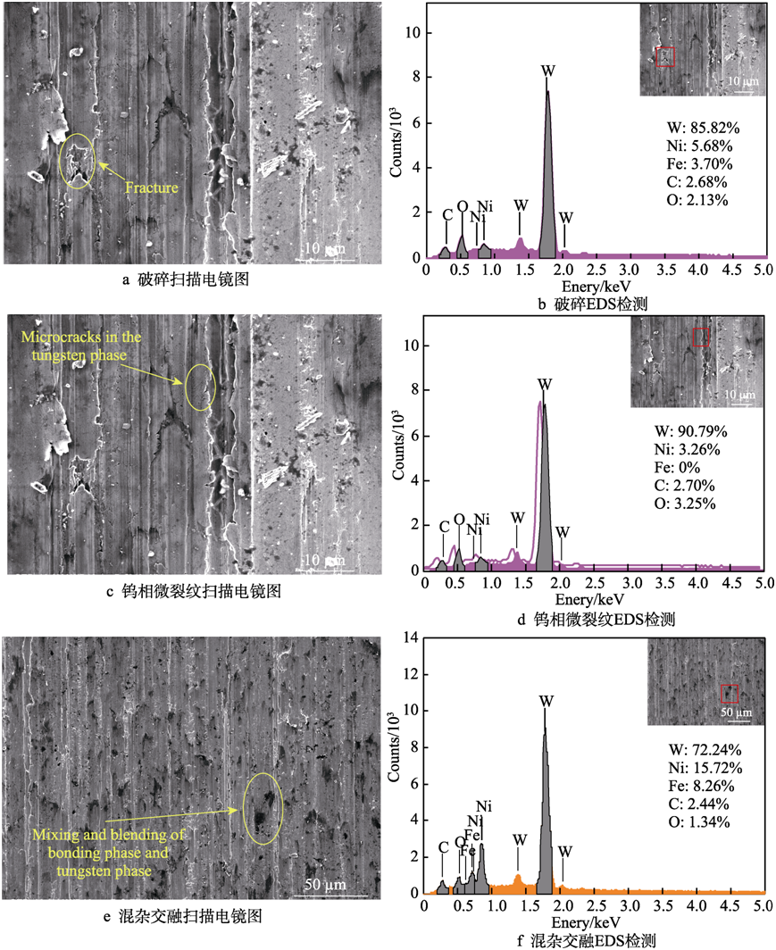 4)磨削後鎢合金表麵出現(xiàn)了單顆粒刻劃劃痕上的所有去除特征,與單顆粒劃(huá)痕去除特征吻合。不同的是,磨削後的劃痕底部出現了區域性和放射狀裂紋,並通過截麵顯微法和 EDS 檢測技術探究了裂紋的成因(yīn)及擴(kuò)展情況。