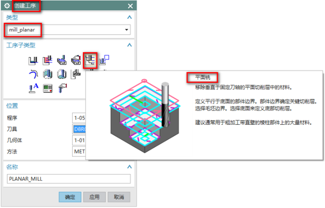 在加工界麵中,【創建工序】-【mill_planar】-【平麵銑】,如下圖所示: